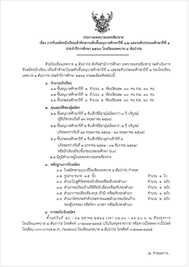 ประกาศรับสมัครนักเรียนระดับอนุบาล1 และประถมศึกษาปีที่ 1 ปีการศึกษา 2569 ตุลาคม 5, 2025ตุลาคม 5, 2025 Admin ข่าวประกาศ, ประชาสัมพันธ์กิจกรรม สามารถกดดาวน์โหลด >>>> ใบรับสมัครเข้าเรียน ท.4 ปีการศึกษา 2569 << Admin